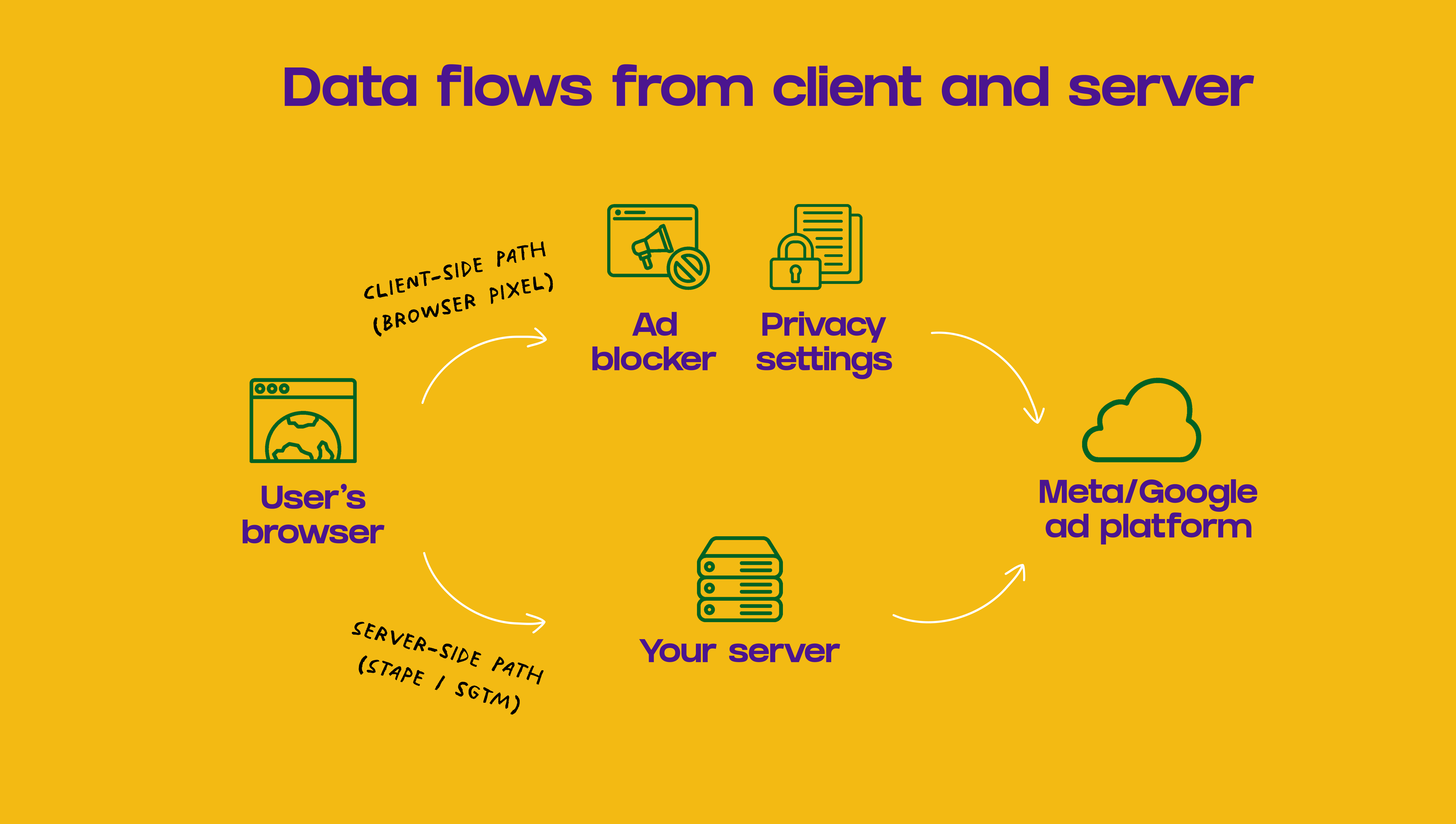 The problem: client-side is vulnerable to anything that interferes with the client. Ad blockers, privacy settings, connection issues, or the user closing the page before the script finishes. When any of these happen, the event never reaches your ad platform.