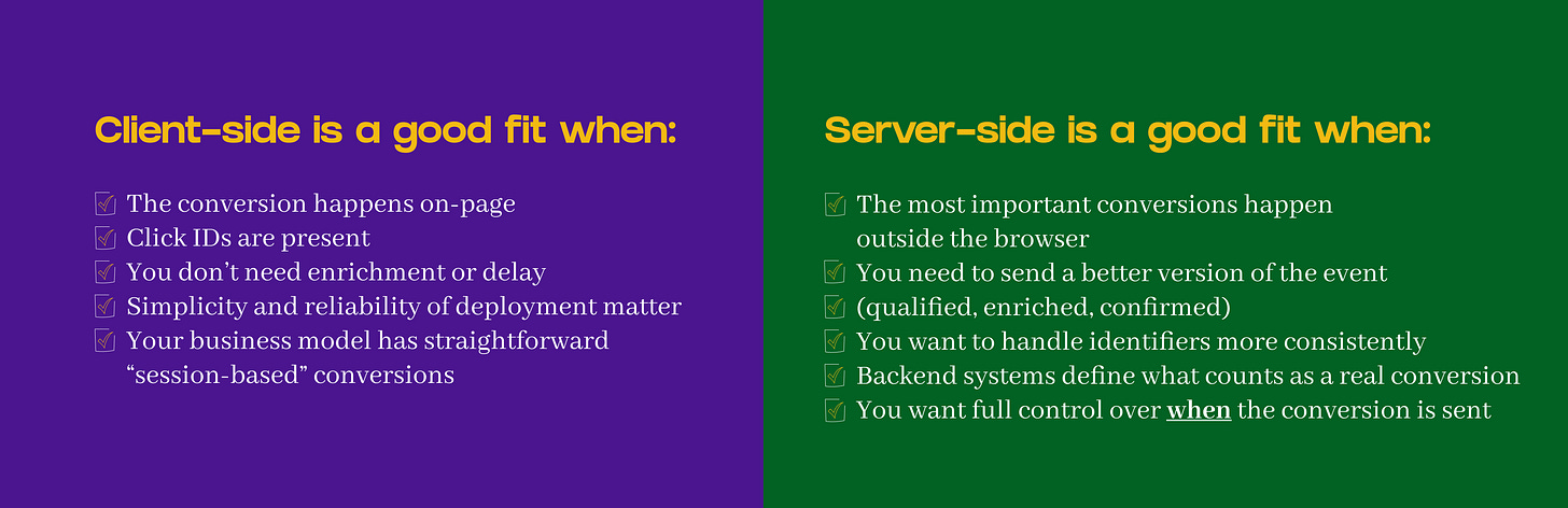 Client-side makes sense when conversion happens on-page during the session, click IDs are reliable, you don’t need enrichment or delay, simplicity matters, and you have limited engineering resources.