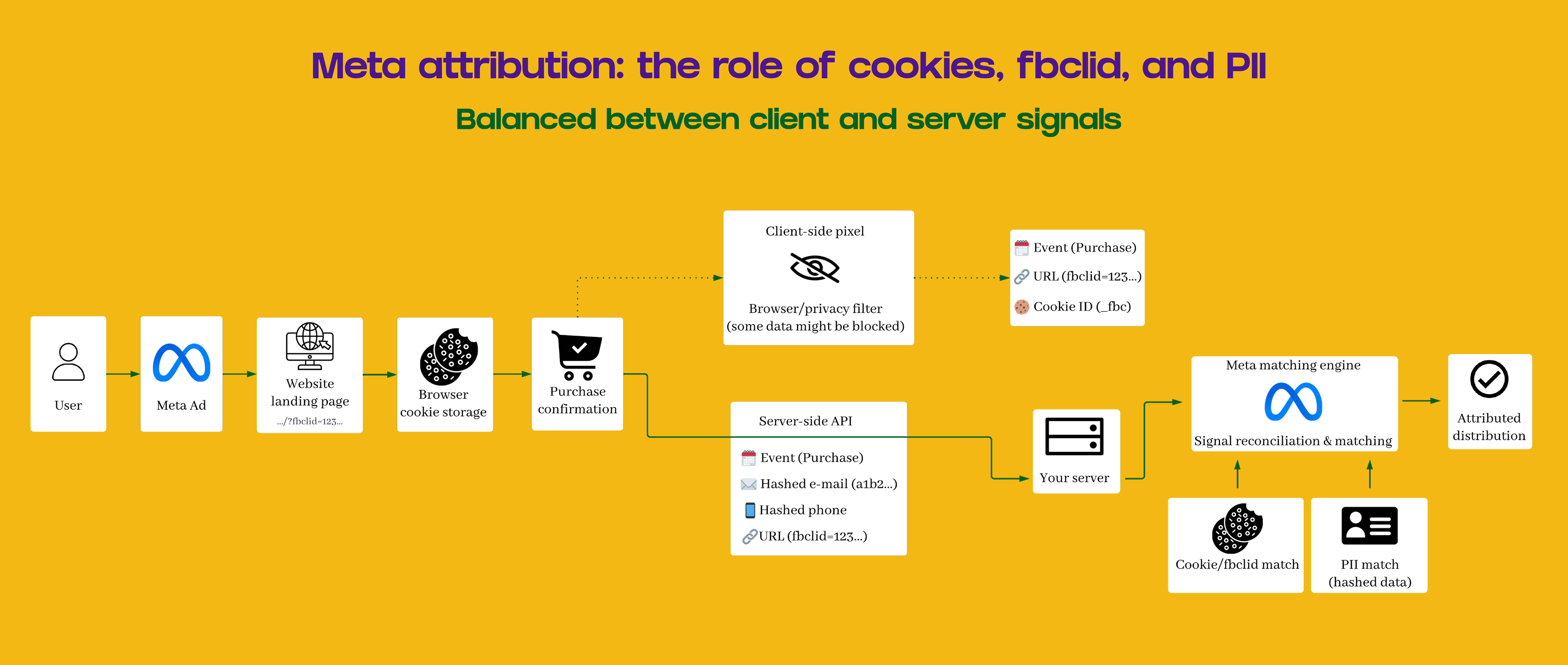 Client-side attribution uses click IDs from the browser (gclid, fbclid), cookies that identify the user, and optional hashed PII (though many teams avoid this for security reasons).