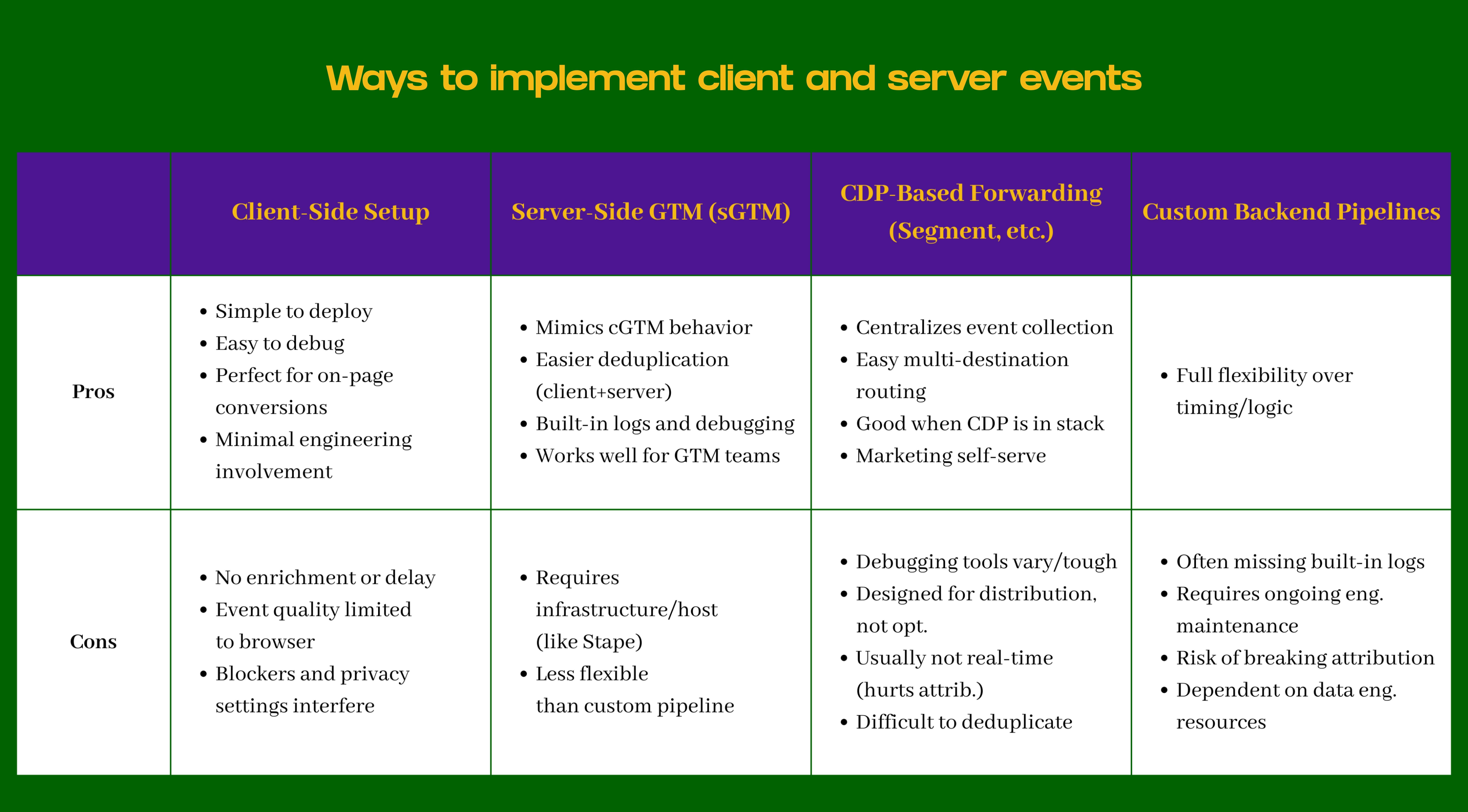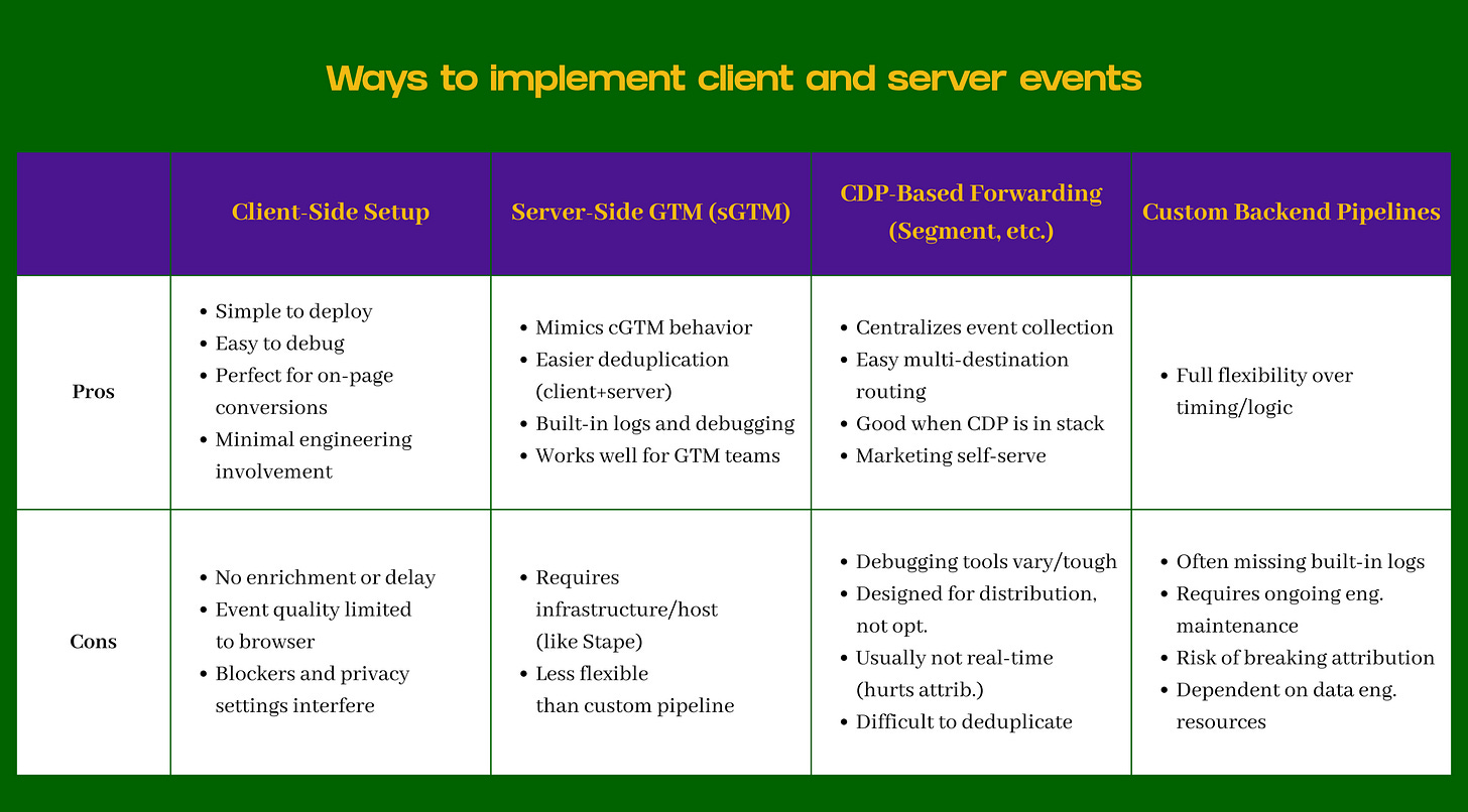 The advantage is complete flexibility over timing, logic, and event structure (like, everything). The disadvantages add up: no built-in logging or debugging tools, every change requires engineering, easy to break attribution if not aligned with client-side logic, and ongoing maintenance becomes a permanent engineering responsibility. Most marketing teams do not love this.