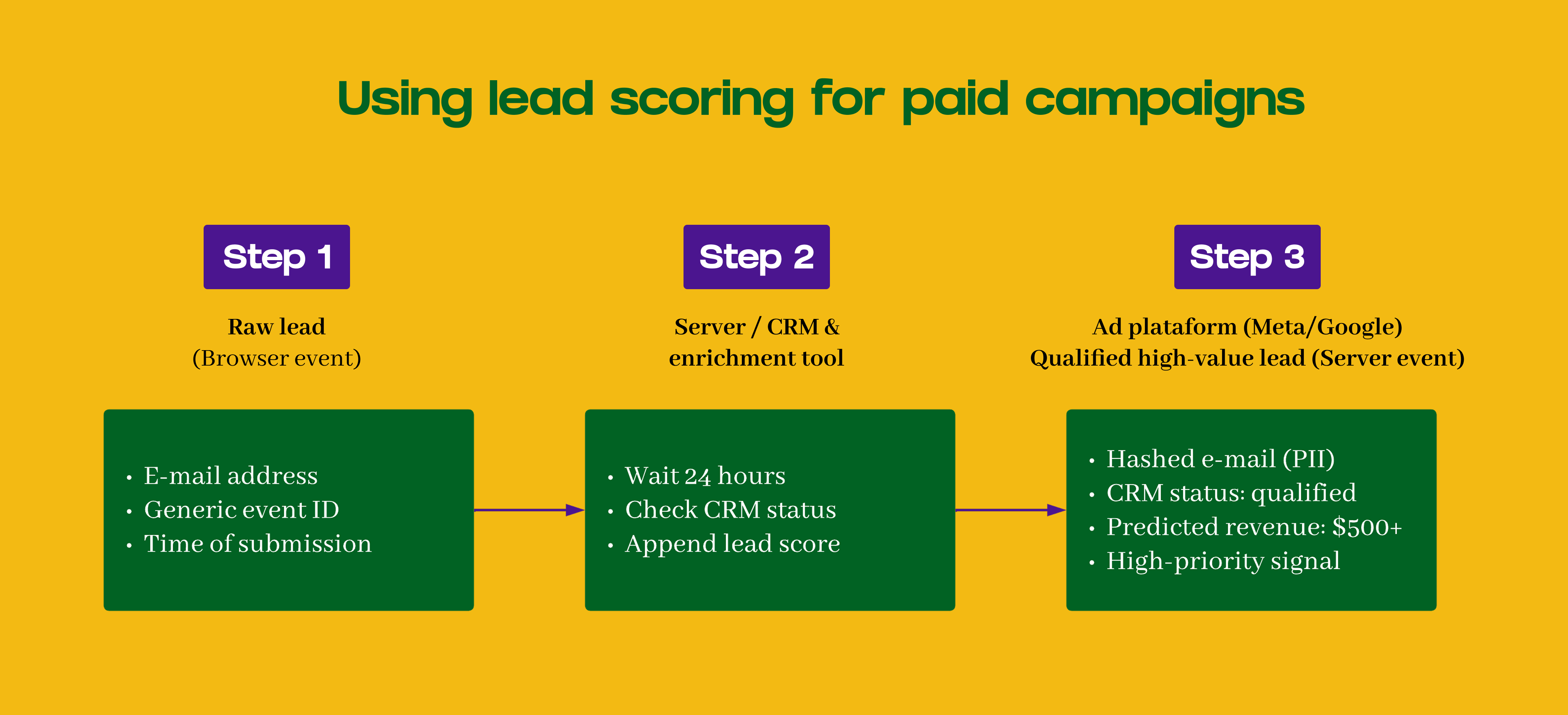 Because it fires from your server, ad blockers and browser privacy settings don’t affect it. More importantly, you can delay when the event fires. You can wait for payment confirmation instead of firing on checkout submission. You can calculate a lead score before marking someone as qualified. You can replace preliminary revenue with fraud-checked amounts.