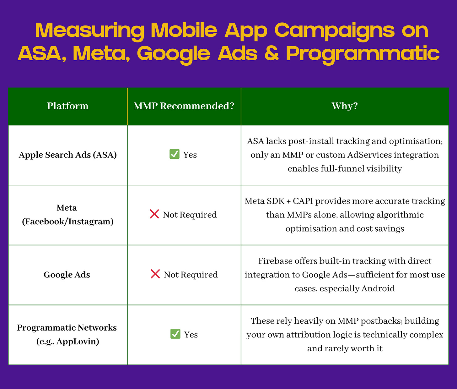 For many companies with moderate budgets focused on major platforms, a hybrid approach may work best—using platform-specific solutions for Google and Meta while using an MMP primarily for programmatic networks or considering whether to invest in these channels at all given the measurement challenges.