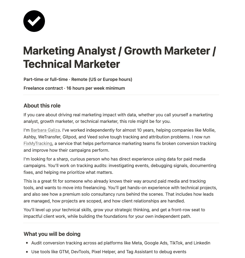 The role is part-time, freelance, remote, focused on technical tracking audits for paid media. It's ideal for marketing analysts or technical marketers who want to go deeper into signals, not just surface-level reporting.