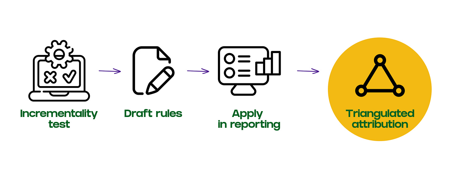 Triangulated attribution is a way to tackle this. Instead of relying on a single data source, you use multiple evidence streams (incrementality tests, self-reported attribution surveys, and platform performance data) to reach a more accurate view of channel impact. Rule-based methodology is how you operationalize it: a structured way to override MTA outputs or enrich journey data before attribution runs, using documented logic that turns experimental findings into repeatable adjustments.