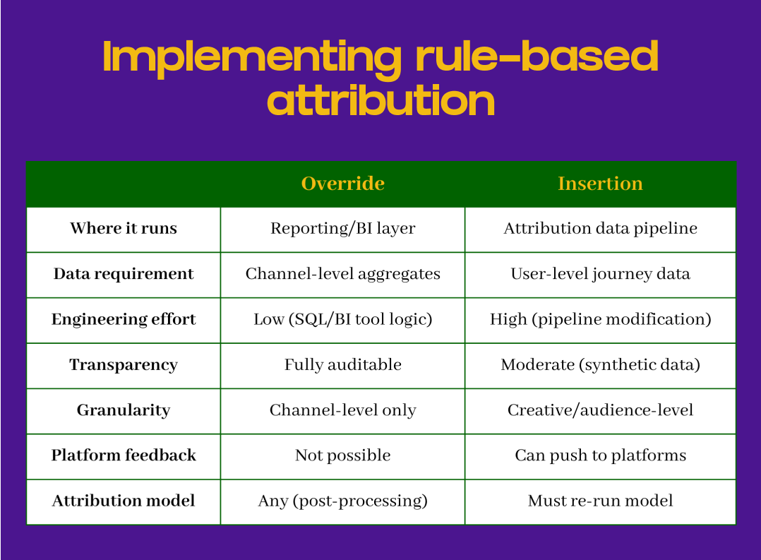 Most organizations should start with this type of override. It requires less infrastructure, produces results faster, and is easier to explain to stakeholders. Only move to insertion when you’ve validated the override approach, have the data quality and engineering resources, and need the additional granularity.